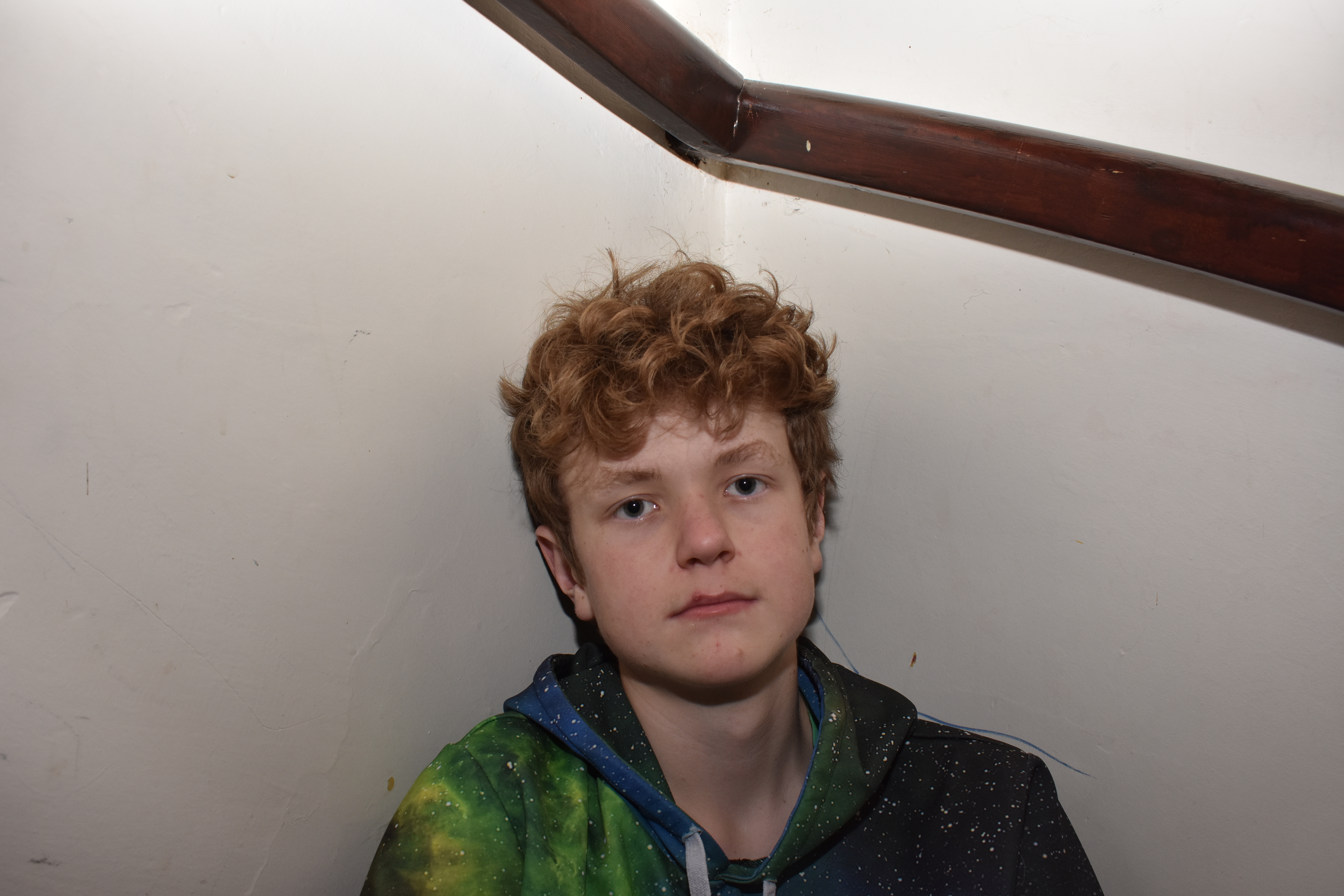 - A portrait, shot indoors using direct flash on manual flash.